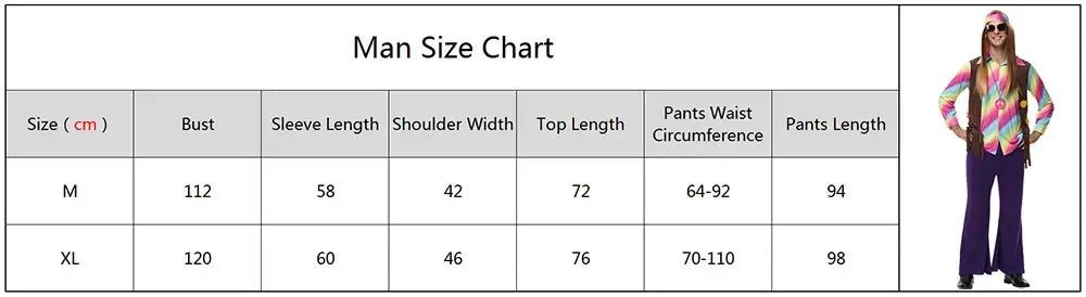 Men’s Set includes a colorful headscarf, patterned shirt, and matching pants for an authentic hippie look.