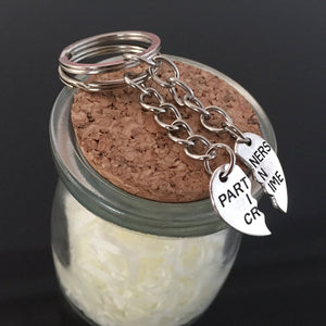 Introducing the 'Partner in Crime' keychains - the perfect emblem of unbreakable ties between you and your closest allies. Every story has its protagonists, and with our Partner in Crime keychains for couples, you immortalize those thrilling escapades you've shared with your confidant. Beautifully crafted and uniquely designed, each piece resonates with tales of laughter, joy, and sometimes mischief.