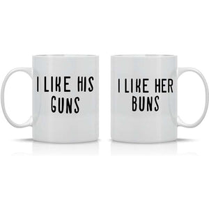Add a dash of humor to your mornings with our I Like Her Buns I Like His Guns Mugs. Perfect for couples who love to laugh together, these matching couple mugs make every sip special. They're microwave and dishwasher safe, ensuring they're as practical as they are charming. Shop now for a playful and loving gift!