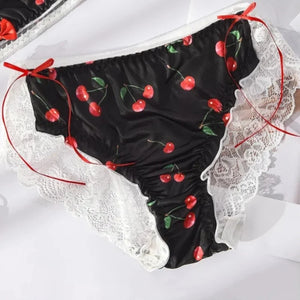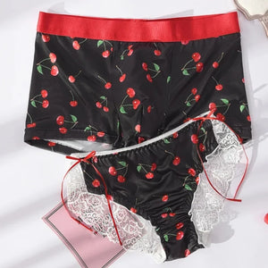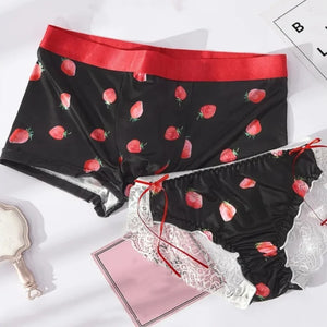 The women’s lace ruffled panties feature a low-waist cut, delicate strawberry and cherry embroidery, and a sweet romantic design that accentuates natural curves. The men’s boxer shorts are tailored for comfort and flexibility, offering a smooth, elastic waistband and lightweight texture ideal for all-day wear.
