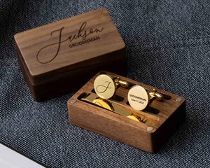 Add a touch of timeless elegance to your special day with our Personalised Cufflink Gift Set. Perfectly designed for grooms, groomsmen, fathers, or boyfriends, this sophisticated set includes a pair of stainless steel cufflinks and a matching tie clip, all presented in a sleek wooden gift box.