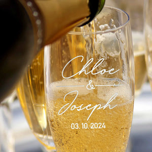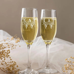 Each glass measures 2" in diameter × 8.2" in height and holds 7 oz. (220 ml) of your favorite bubbly, making them perfect for wedding toasts, anniversaries, bridal showers, or romantic celebrations. Their sleek, modern design pairs beautifully with any table setting, while the engraving adds a heartfelt touch.