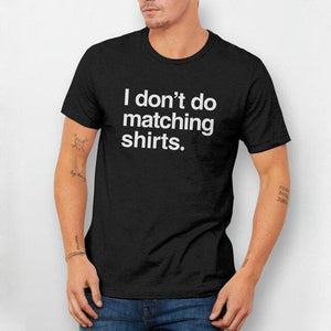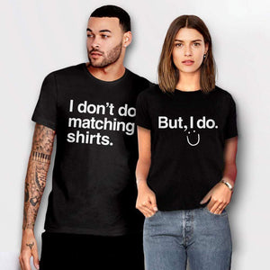 Add a sprinkle of irony to your outfit with our I Don't Do Matching Shirts couple. Perfect for couples who enjoy a good laugh, these matching shirts for couples offer a humorous twist on the typical matching couple apparel. The printed statement – while proclaiming an aversion to matching – ironically appears on both shirts, eliciting chuckles and sparking conversations wherever you go.