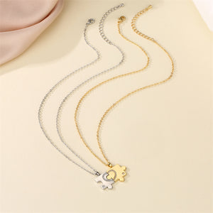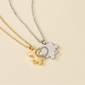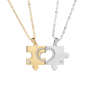Introducing our Silver & Gold Puzzle Couple Necklace – a blend of luxury and love, where individuality interlocks seamlessly with unity. Each puzzle piece, intricately designed in either shimmering silver or glistening gold, represents a unique individual. Together, they come alive, echoing the essence of two souls fitting perfectly into the vast puzzle of life.