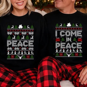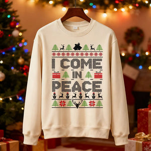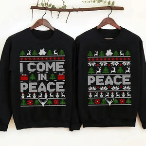 Spread festive cheer with a fun twist in these I Come in Peace Couples Christmas Sweatshirts, a playful matching set that brings smiles wherever you go. Featuring adorable holiday-themed graphics and the charming “I Come in Peace” message, these sweatshirts add a lighthearted, quirky vibe to your Christmas celebrations. Whether you’re attending holiday parties, strolling through winter lights, or taking couples photos, these matching tops show off your fun-loving connection.